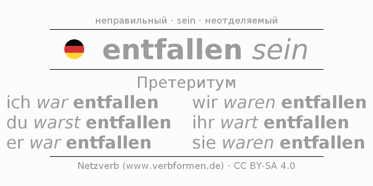 Спряжение entfallen в Претеритум Индикатив Прошлое время Пассив с sein: ich war entfallen, du warst entfallen, er war entfallen, wir waren entfallen, ihr wart entfallen, sie waren entfallen.Образование этих форм происходит по определённым грамматическим правилам. Так же спрягаются простые глагольные формы entfallen в Претеритум. Kомментарии ☆
