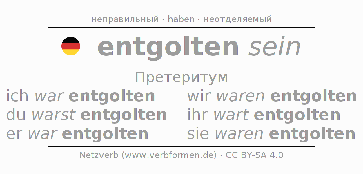 Спряжение entgelten в Претеритум Индикатив Прошлое время Пассив с sein: ich war entgolten, du warst entgolten, er war entgolten, wir waren entgolten, ihr wart entgolten, sie waren entgolten.Образование этих форм происходит по определённым грамматическим правилам. Так же спрягаются простые глагольные формы entgelten в Претеритум. Kомментарии ☆
