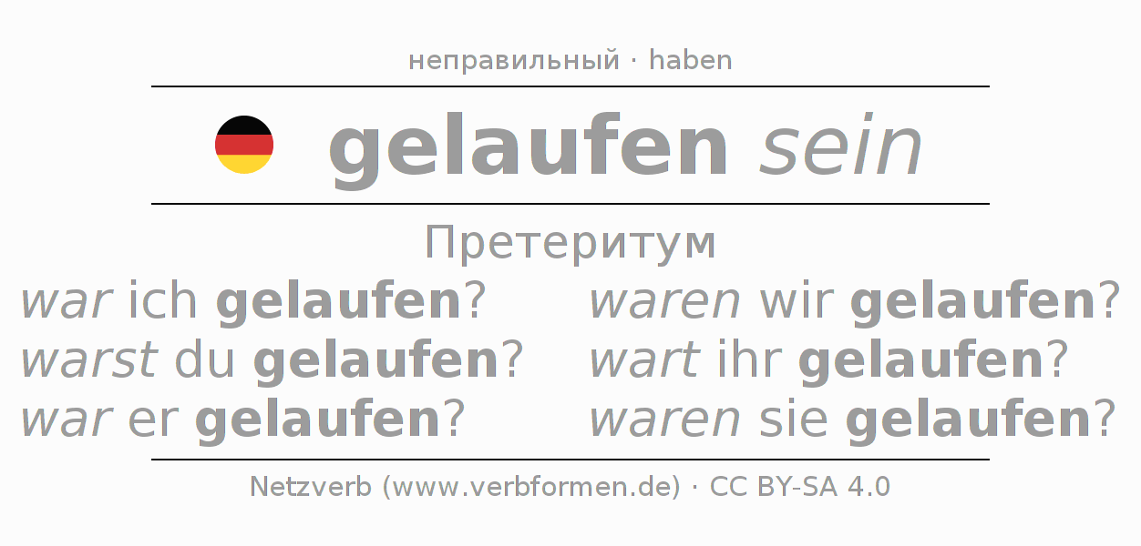 Спряжение laufen в Претеритум Индикатив Прошлое время Пассив с sein: war ich gelaufen?, warst du gelaufen?, war er gelaufen?, waren wir gelaufen?, wart ihr gelaufen?, waren sie gelaufen?.Образование этих форм происходит по определённым грамматическим правилам. Так же спрягаются простые глагольные формы laufen в Претеритум. 3Комментарии ☆4.3333335