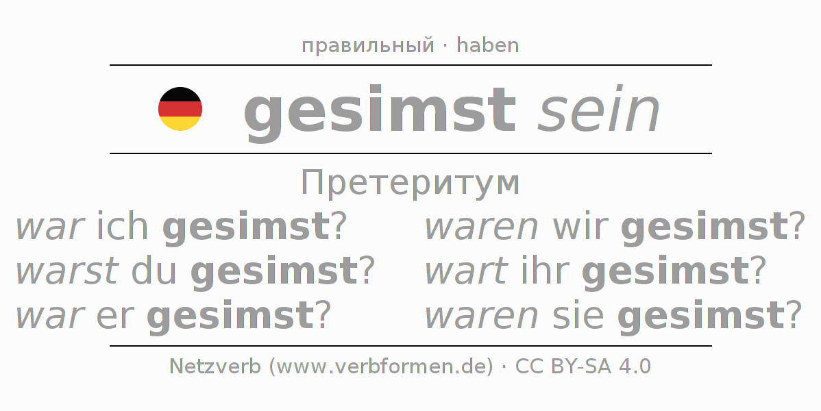 Спряжение simsen в Претеритум Индикатив Прошлое время Пассив с sein: war ich gesimst?, warst du gesimst?, war er gesimst?, waren wir gesimst?, wart ihr gesimst?, waren sie gesimst?.Образование этих форм происходит по определённым грамматическим правилам. Так же спрягаются простые глагольные формы simsen в Претеритум. Kомментарии ☆