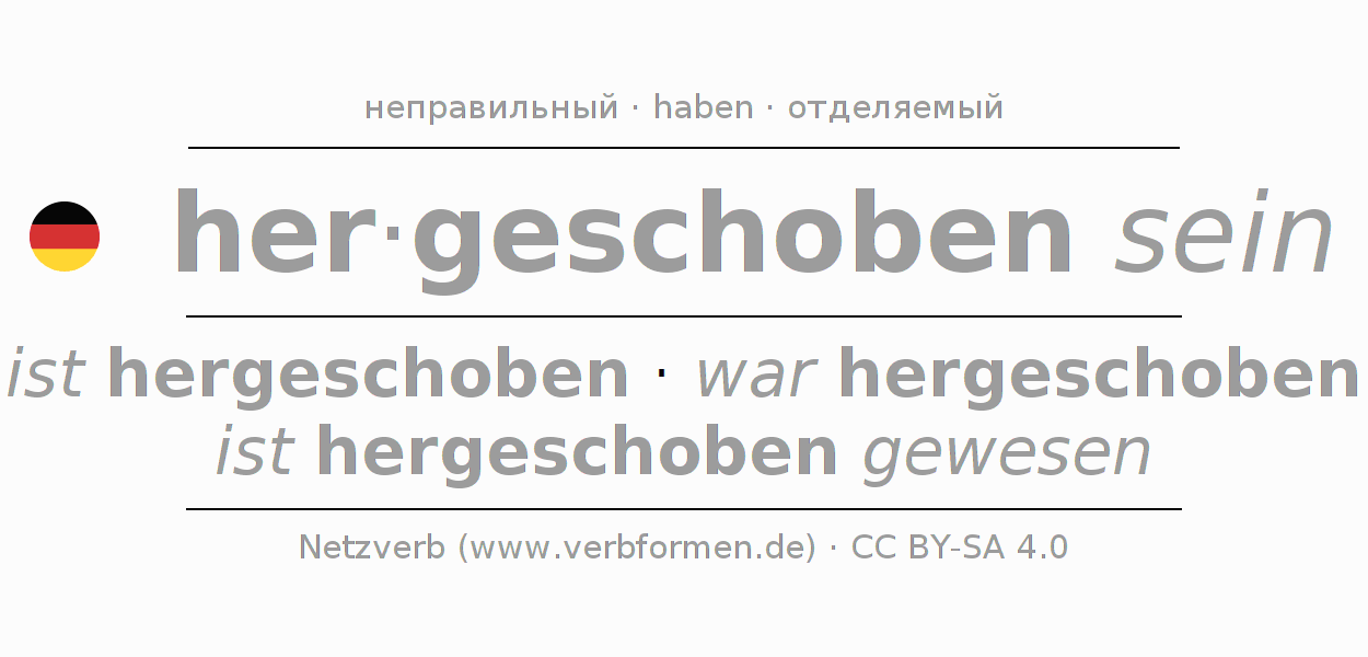 Спряжение herschieben в Претеритум Индикатив Прошлое время Пассив с sein: ich war hergeschoben, du warst hergeschoben, er war hergeschoben, wir waren hergeschoben, ihr wart hergeschoben, sie waren hergeschoben.Образование этих форм происходит по определённым грамматическим правилам. Так же спрягаются простые глагольные формы herschieben в Претеритум. Kомментарии ☆