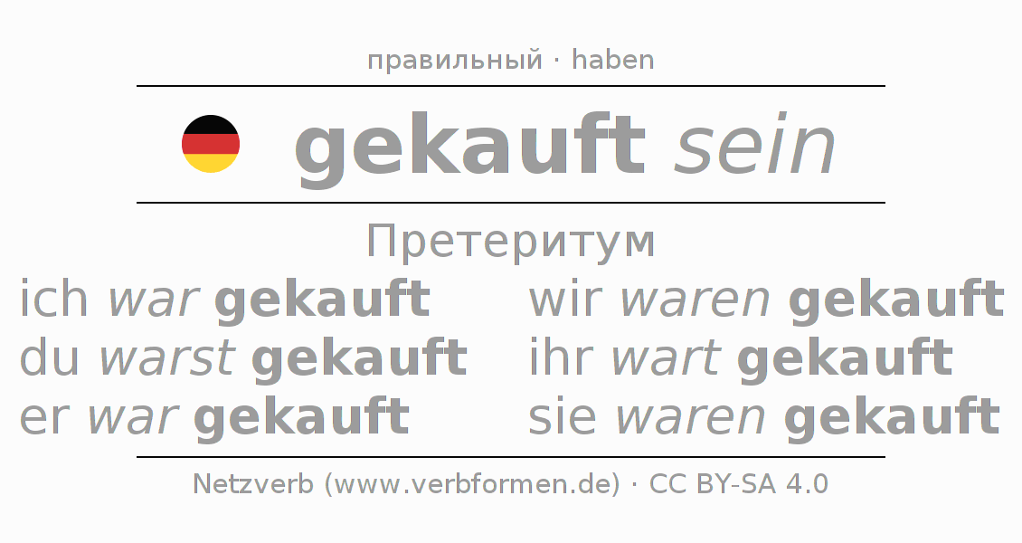 Спряжение kaufen в Претеритум Индикатив Прошлое время Пассив с sein: ich war gekauft, du warst gekauft, er war gekauft, wir waren gekauft, ihr wart gekauft, sie waren gekauft.Образование этих форм происходит по определённым грамматическим правилам. Так же спрягаются простые глагольные формы kaufen в Претеритум. 1Комментарий ☆5.0