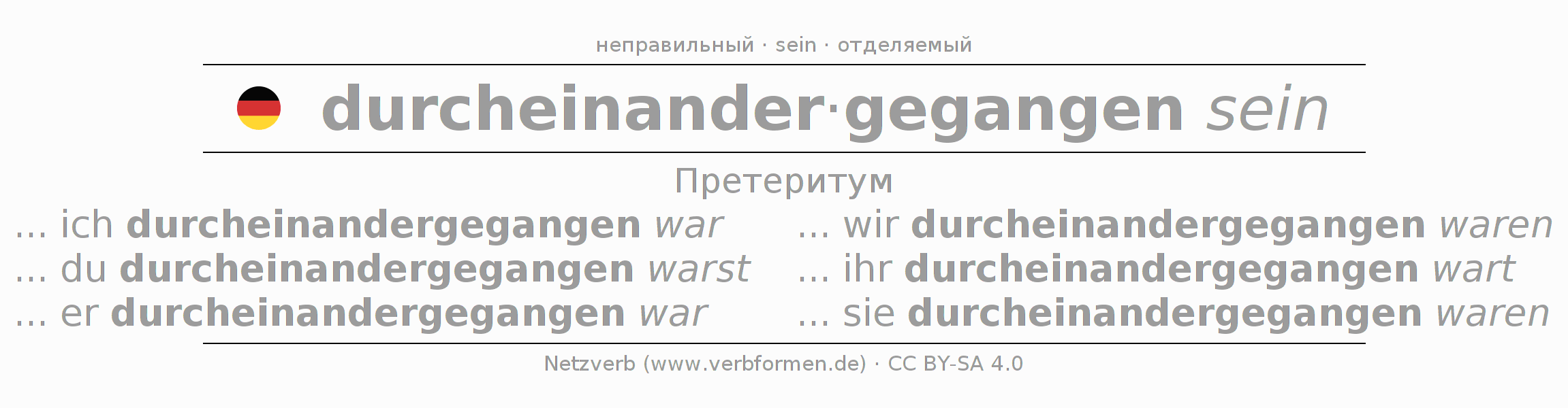 Спряжение durcheinandergehen в Претеритум Индикатив Прошлое время Пассив с sein: ... ich durcheinandergegangen war, ... du durcheinandergegangen warst, ... er durcheinandergegangen war, ... wir durcheinandergegangen waren, ... ihr durcheinandergegangen wart, ... sie durcheinandergegangen waren.Образование этих форм происходит по определённым грамматическим правилам. Так же спрягаются простые глагольные формы durcheinandergehen в Претеритум. Kомментарии ☆