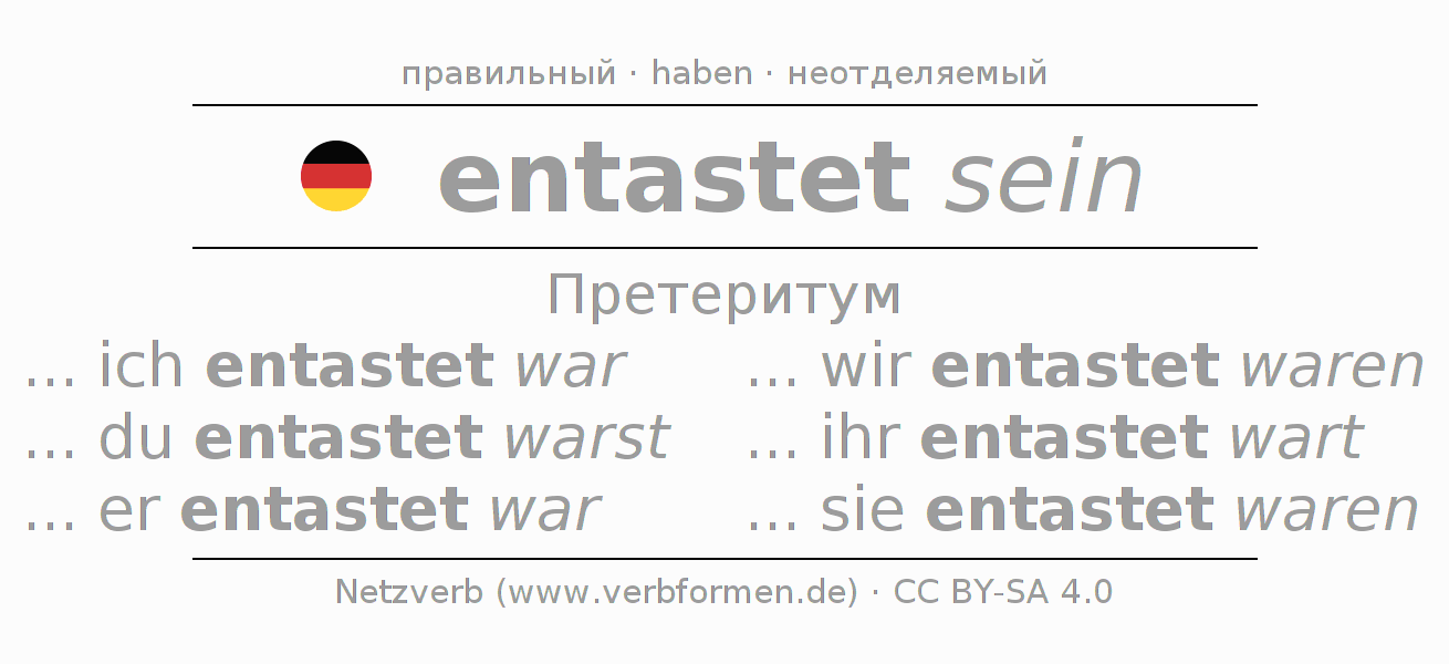 Спряжение entasten в Претеритум Индикатив Прошлое время Пассив с sein: ... ich entastet war, ... du entastet warst, ... er entastet war, ... wir entastet waren, ... ihr entastet wart, ... sie entastet waren.Образование этих форм происходит по определённым грамматическим правилам. Так же спрягаются простые глагольные формы entasten в Претеритум. Kомментарии ☆