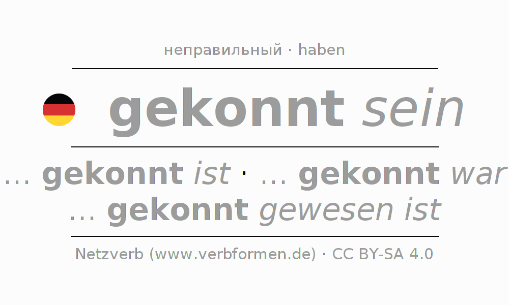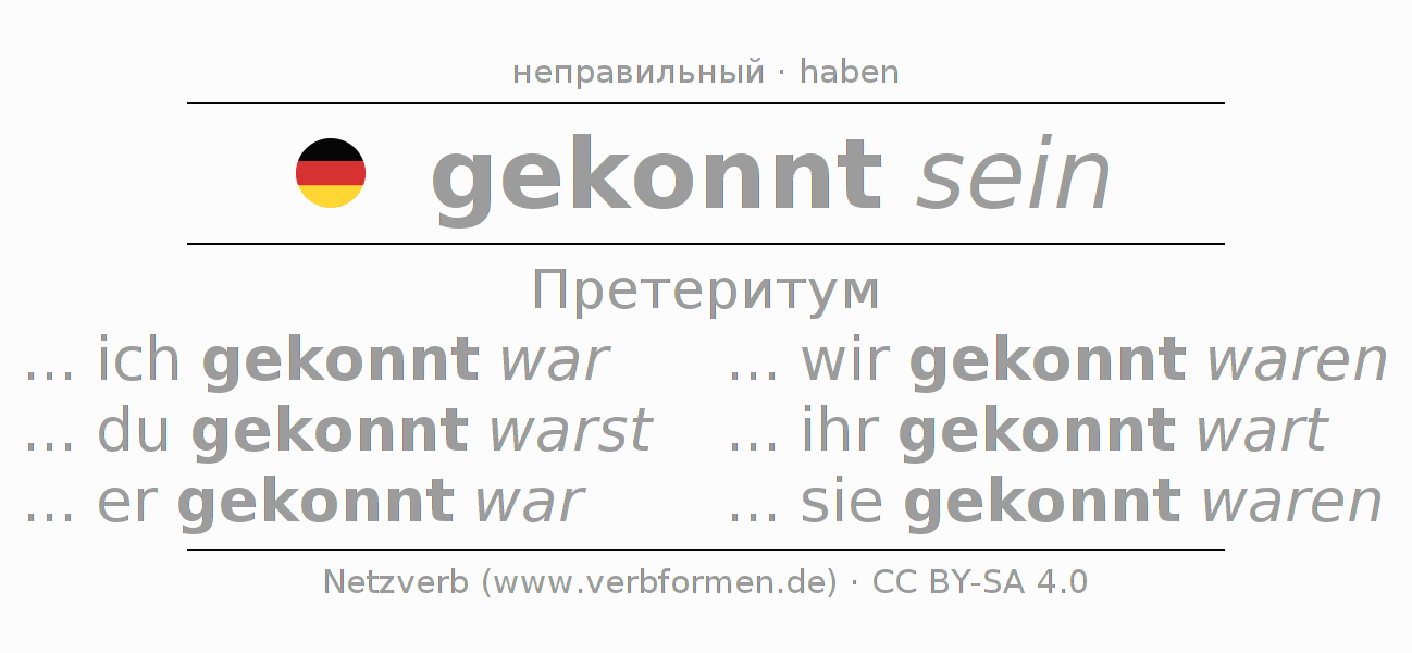 Спряжение können в Претеритум Индикатив Прошлое время Пассив с sein: ... ich gekonnt war, ... du gekonnt warst, ... er gekonnt war, ... wir gekonnt waren, ... ihr gekonnt wart, ... sie gekonnt waren.Образование этих форм происходит по определённым грамматическим правилам. Так же спрягаются простые глагольные формы können в Претеритум. 2Комментарии ☆5.0