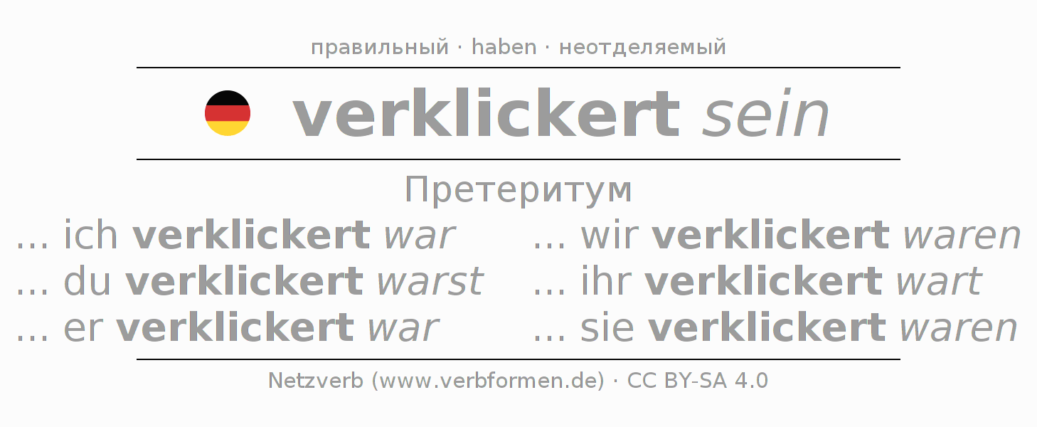 Спряжение verklickern в Претеритум Индикатив Прошлое время Пассив с sein: ... ich verklickert war, ... du verklickert warst, ... er verklickert war, ... wir verklickert waren, ... ihr verklickert wart, ... sie verklickert waren.Образование этих форм происходит по определённым грамматическим правилам. Так же спрягаются простые глагольные формы verklickern в Претеритум. Kомментарии ☆
