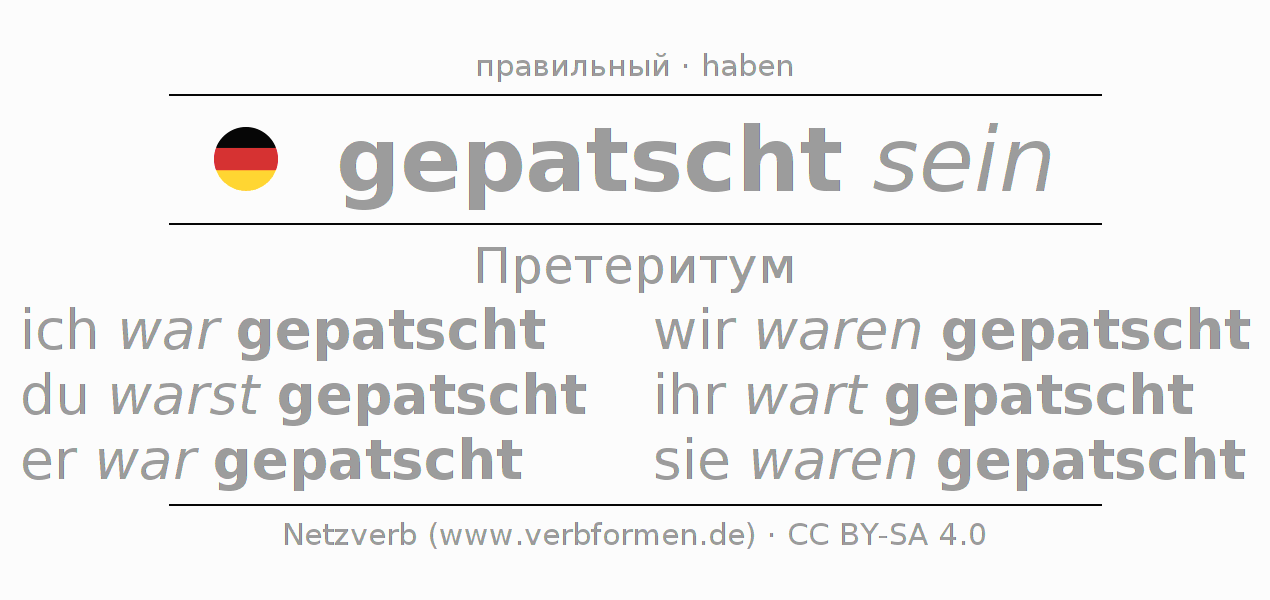 Спряжение patschen в Претеритум Индикатив Прошлое время Пассив с sein: ich war gepatscht, du warst gepatscht, er war gepatscht, wir waren gepatscht, ihr wart gepatscht, sie waren gepatscht.Образование этих форм происходит по определённым грамматическим правилам. Так же спрягаются простые глагольные формы patschen в Претеритум. Kомментарии ☆