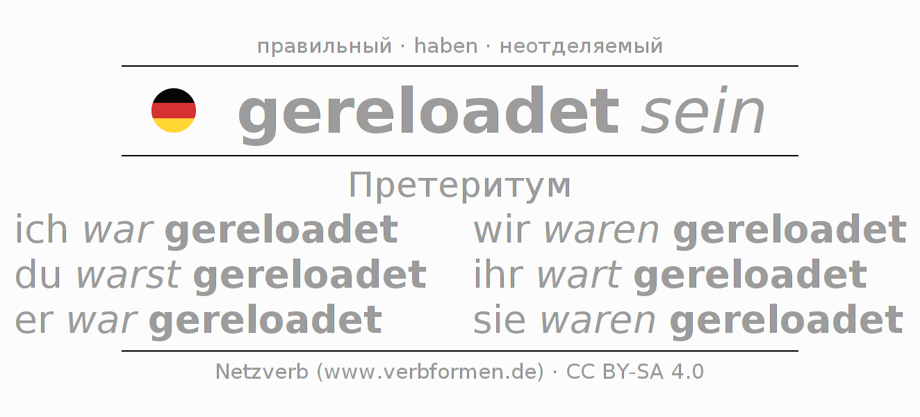 Спряжение reloaden в Претеритум Индикатив Прошлое время Пассив с sein: ich war gereloadet, du warst gereloadet, er war gereloadet, wir waren gereloadet, ihr wart gereloadet, sie waren gereloadet.Образование этих форм происходит по определённым грамматическим правилам. Так же спрягаются простые глагольные формы reloaden в Претеритум. Kомментарии ☆