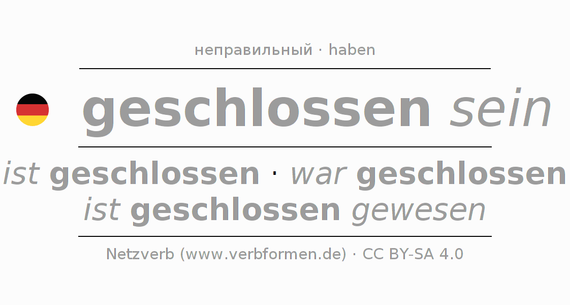 Спряжение schließen в Претеритум Индикатив Прошлое время Пассив с sein: ich war geschlossen, du warst geschlossen, er war geschlossen, wir waren geschlossen, ihr wart geschlossen, sie waren geschlossen.Образование этих форм происходит по определённым грамматическим правилам. Так же спрягаются простые глагольные формы schließen в Претеритум. Kомментарии ☆