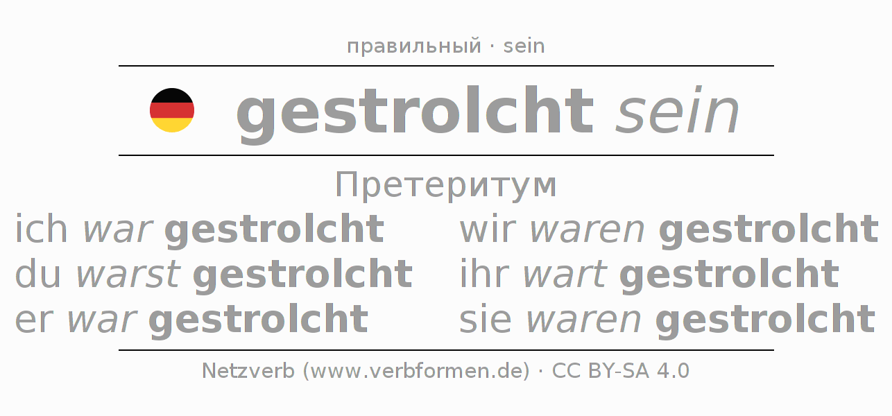 Спряжение strolchen в Претеритум Индикатив Прошлое время Пассив с sein: ich war gestrolcht, du warst gestrolcht, er war gestrolcht, wir waren gestrolcht, ihr wart gestrolcht, sie waren gestrolcht.Образование этих форм происходит по определённым грамматическим правилам. Так же спрягаются простые глагольные формы strolchen в Претеритум. Kомментарии ☆