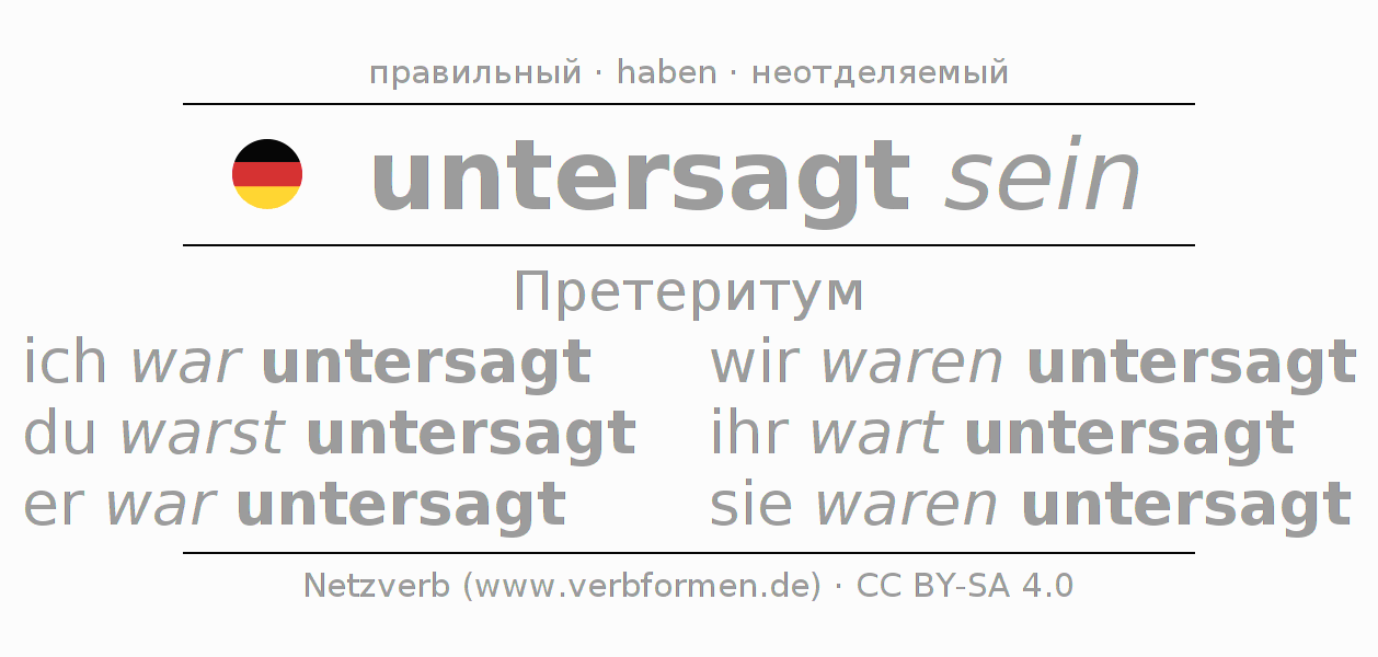 Спряжение untersagen в Претеритум Индикатив Прошлое время Пассив с sein: ich war untersagt, du warst untersagt, er war untersagt, wir waren untersagt, ihr wart untersagt, sie waren untersagt.Образование этих форм происходит по определённым грамматическим правилам. Так же спрягаются простые глагольные формы untersagen в Претеритум. Kомментарии ☆