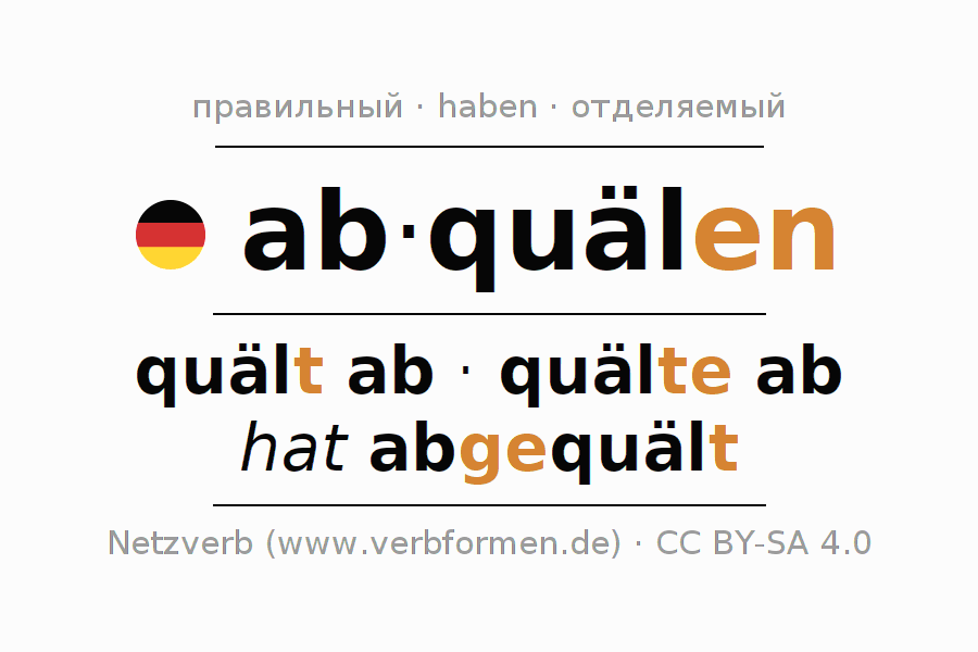 Этот глагол abquälen полностью спрягается во всех лицах и числах Инфинитив Презенс Перфект.