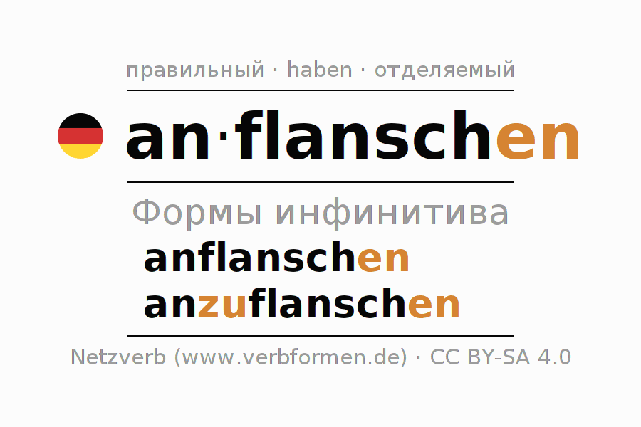 Этот глагол anflanschen полностью спрягается во всех лицах и числах Инфинитив Презенс Перфект.