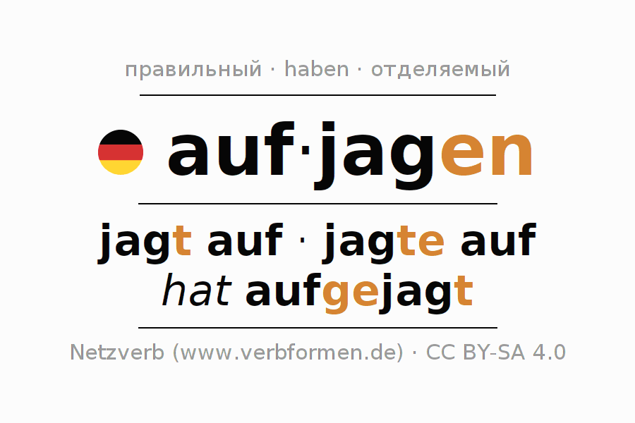 Этот глагол aufjagen полностью спрягается во всех лицах и числах Инфинитив Презенс Перфект.