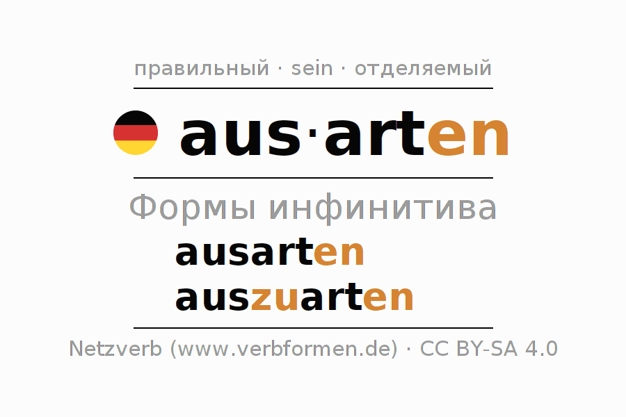 Этот глагол ausarten полностью спрягается во всех лицах и числах Инфинитив Презенс Перфект.