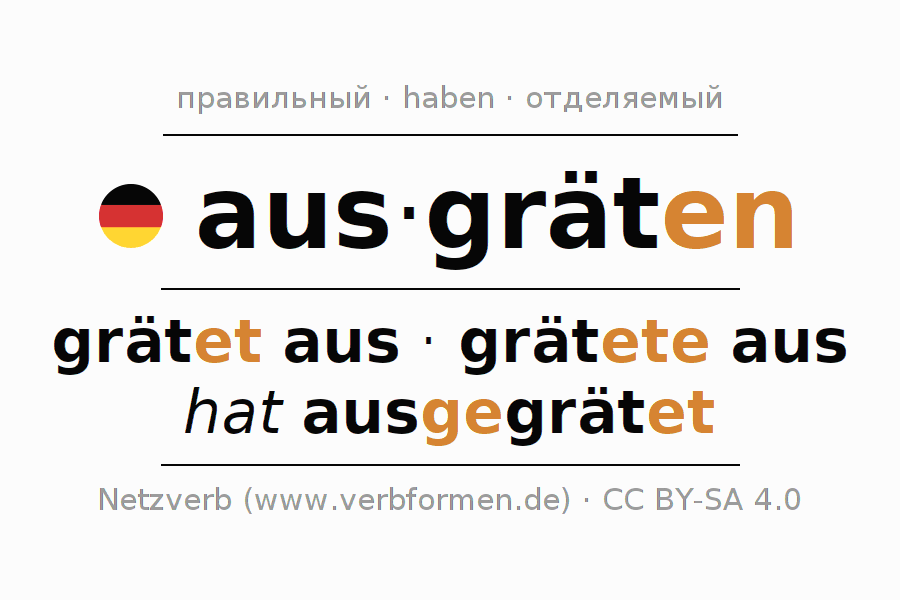 Этот глагол ausgräten полностью спрягается во всех лицах и числах Инфинитив Презенс Перфект.