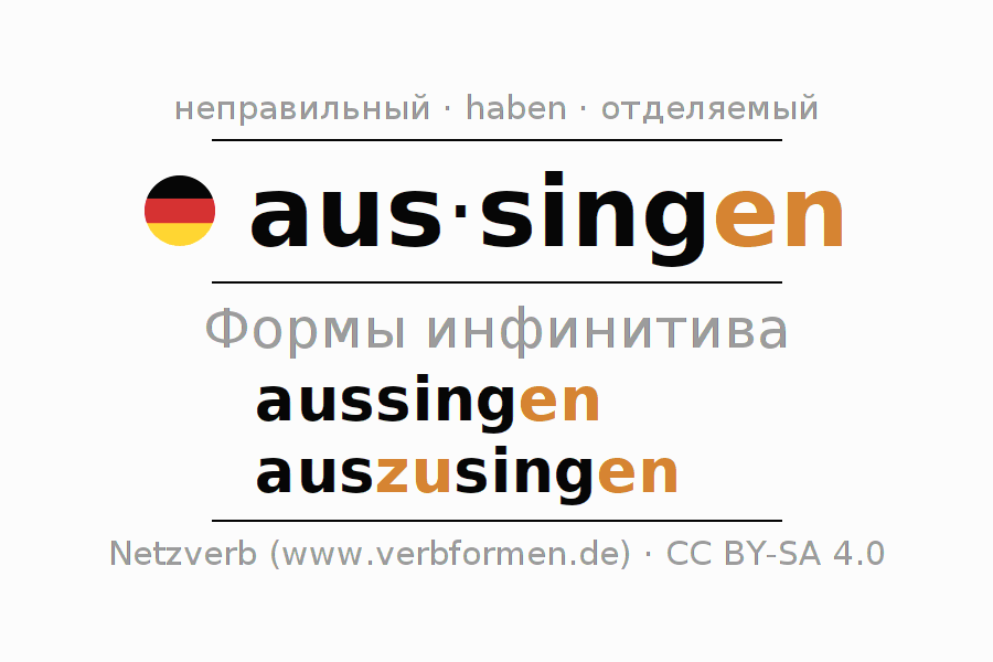 Этот глагол aussingen полностью спрягается во всех лицах и числах Инфинитив Презенс Перфект.