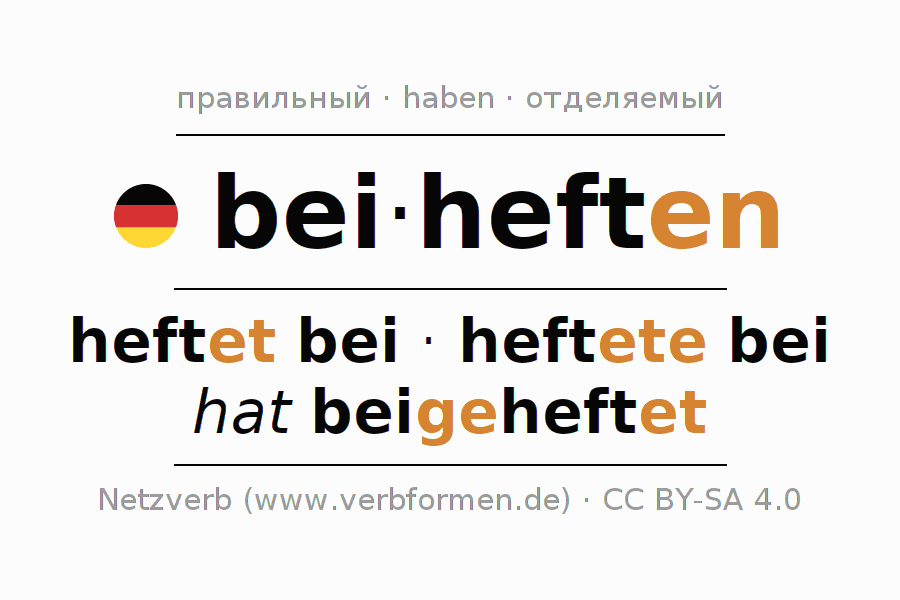 Этот глагол beiheften полностью спрягается во всех лицах и числах Инфинитив Презенс Перфект.