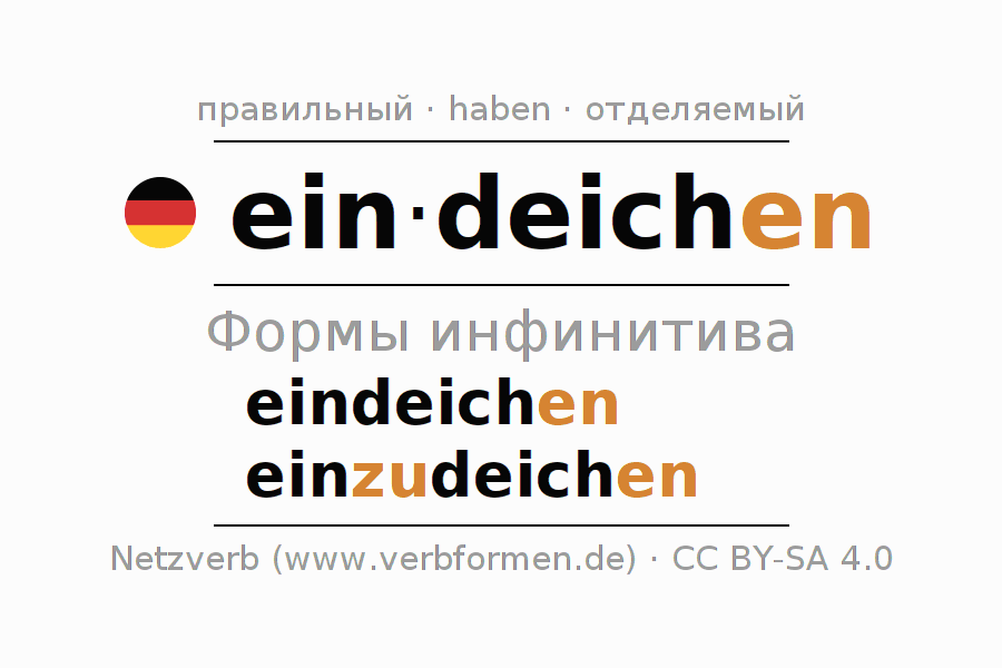 Этот глагол eindeichen полностью спрягается во всех лицах и числах Инфинитив Презенс Перфект.