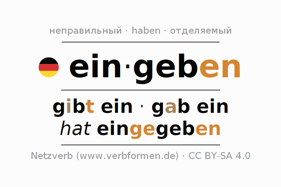 Этот глагол eingeben полностью спрягается во всех лицах и числах Инфинитив Презенс Перфект.