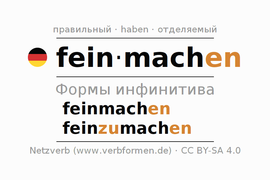 Этот глагол feinmachen полностью спрягается во всех лицах и числах Инфинитив Презенс Перфект.