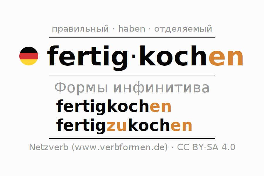 Этот глагол fertigkochen полностью спрягается во всех лицах и числах Инфинитив Презенс Перфект.