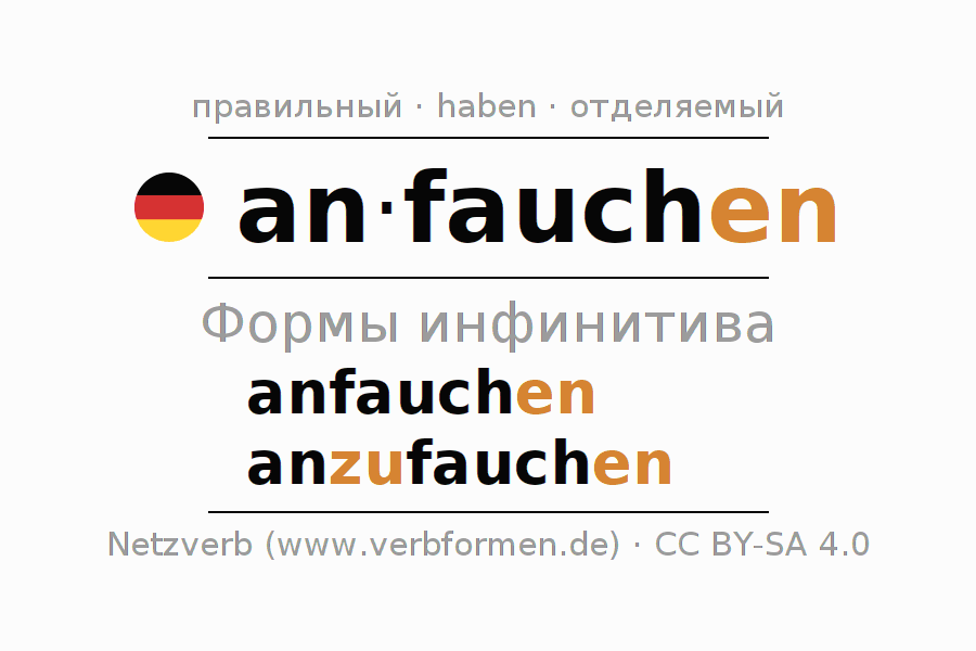 Этот глагол anfauchen полностью спрягается во всех лицах и числах Инфинитив Презенс Перфект.
