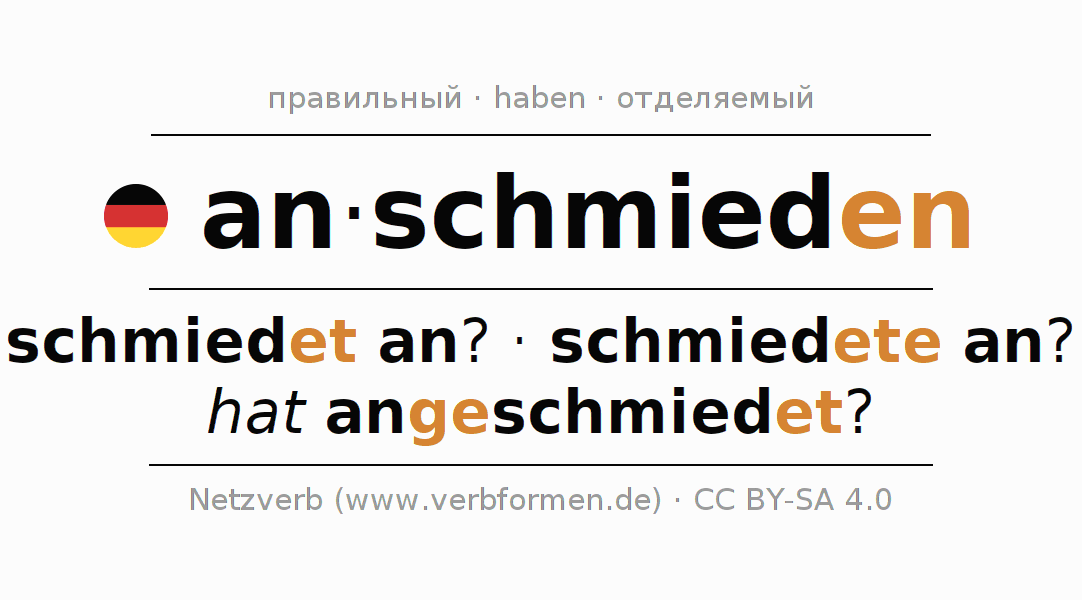 Этот глагол anschmieden полностью спрягается во всех лицах и числах Инфинитив Презенс Перфект.