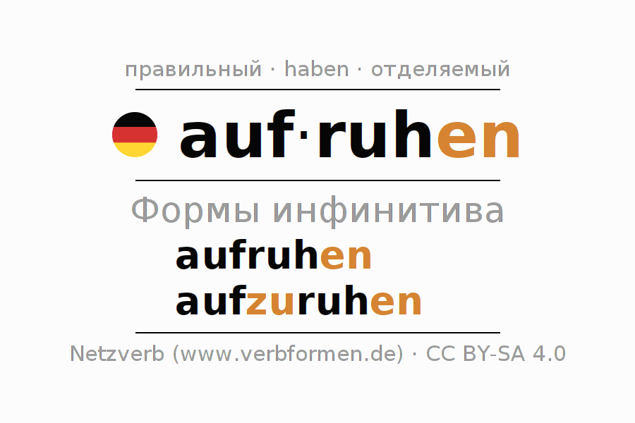 Спряжение aufruhen в Инфинитив Презенс Перфект основная форма Действительный залог (актив): aufruh(e)n, aufzuruh(e)n.Образование этих форм происходит по определённым грамматическим правилам. Так же спрягаются простые глагольные формы aufruhen в Инфинитив. Kомментарии ☆