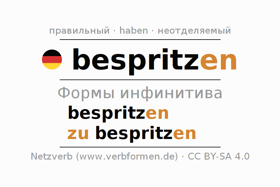 Этот глагол bespritzen полностью спрягается во всех лицах и числах Инфинитив Презенс Перфект.