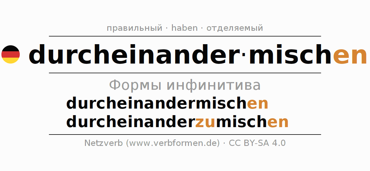 Этот глагол durcheinandermischen полностью спрягается во всех лицах и числах Инфинитив Презенс Перфект.