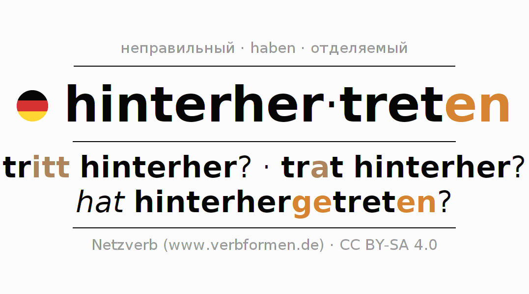 Этот глагол hinterhertreten (hat) полностью спрягается во всех лицах и числах Инфинитив Презенс Перфект.