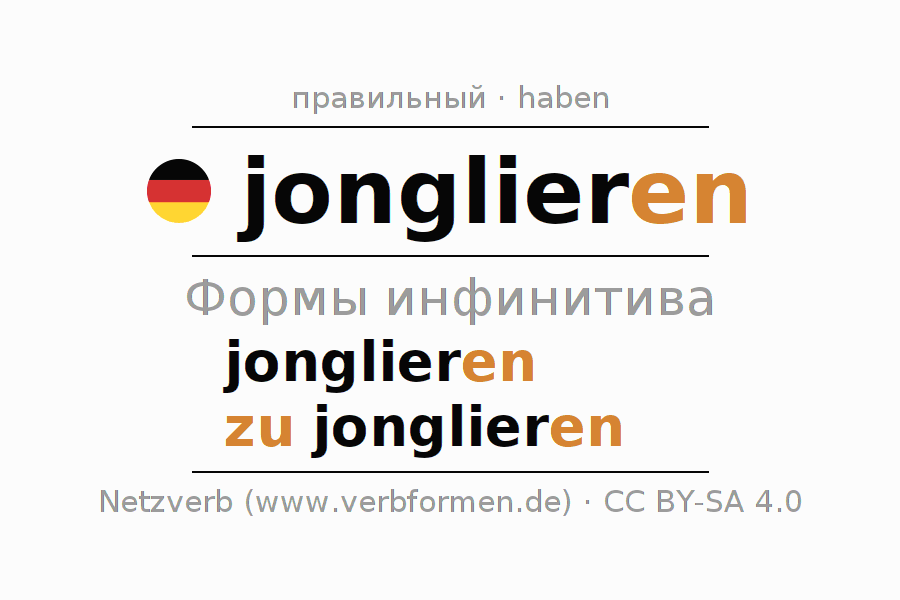 Этот глагол jonglieren полностью спрягается во всех лицах и числах Инфинитив Презенс Перфект.
