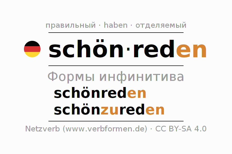 Этот глагол schönreden полностью спрягается во всех лицах и числах Инфинитив Презенс Перфект.
