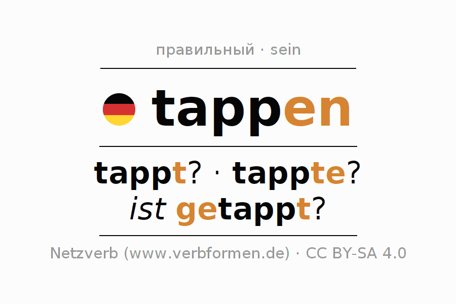 Спряжение tappen в Инфинитив Презенс Перфект основная форма Действительный залог (актив): tappen, zu tappen.Образование этих форм происходит по определённым грамматическим правилам. Так же спрягаются простые глагольные формы tappen в Инфинитив. Kомментарии ☆