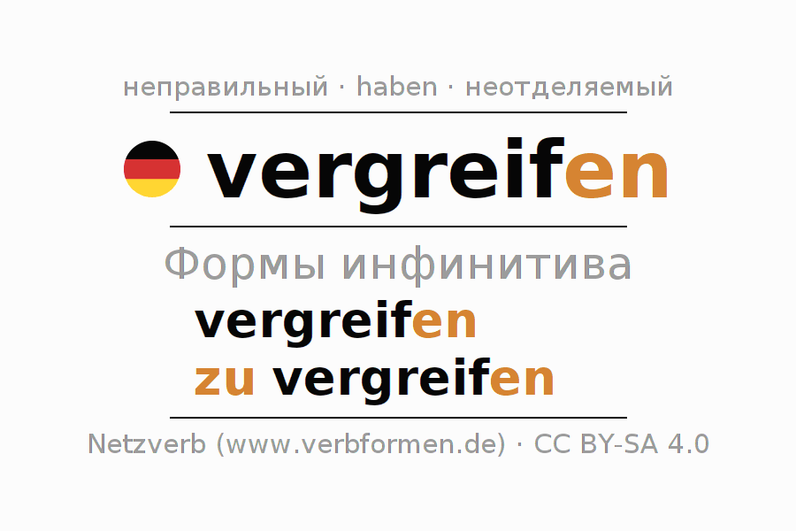Этот глагол vergreifen полностью спрягается во всех лицах и числах Инфинитив Презенс Перфект.