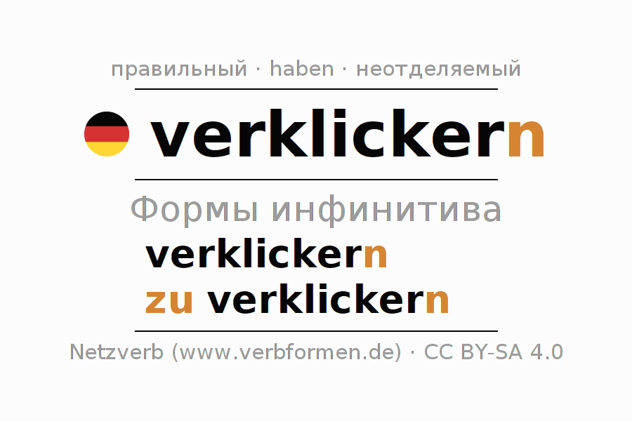 Этот глагол verklickern полностью спрягается во всех лицах и числах Инфинитив Презенс Перфект.