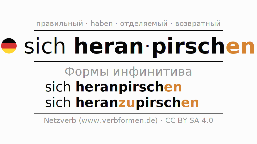 Этот глагол sich heranpirschen полностью спрягается во всех лицах и числах Инфинитив Презенс Перфект.