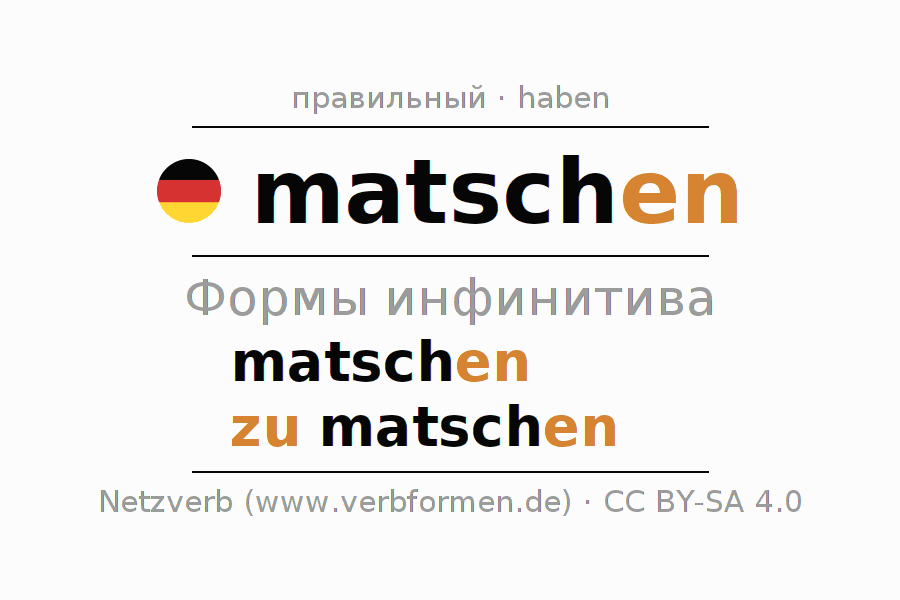 Этот глагол matschen полностью спрягается во всех лицах и числах Инфинитив Презенс Перфект.