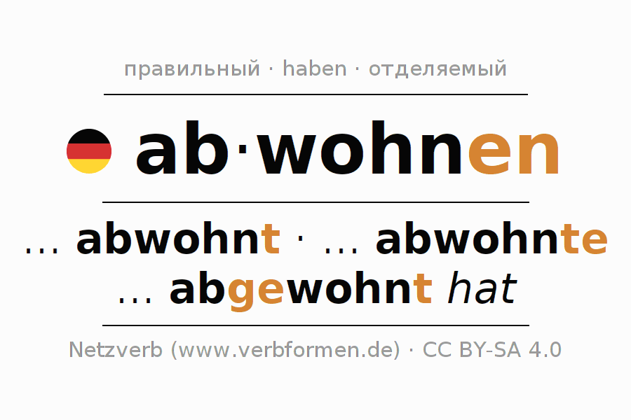 Этот глагол abwohnen полностью спрягается во всех лицах и числах Инфинитив Презенс Перфект.