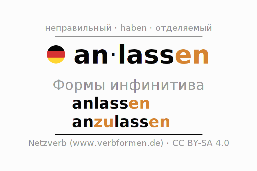 Этот глагол anlassen полностью спрягается во всех лицах и числах Инфинитив Презенс Перфект.