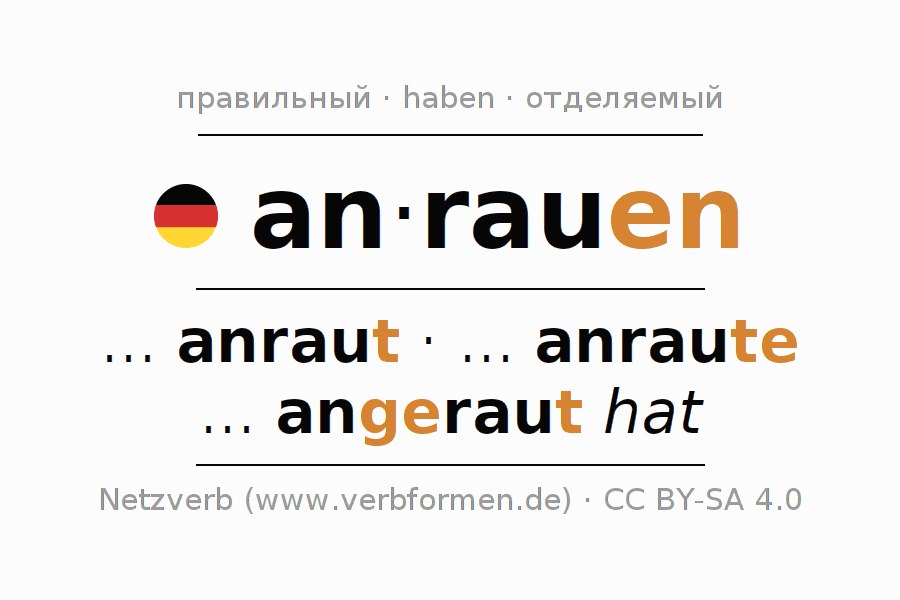 Спряжение anrauen в Инфинитив Презенс Перфект основная форма Действительный залог (актив): anrau(e)n, anzurau(e)n.Образование этих форм происходит по определённым грамматическим правилам. Так же спрягаются простые глагольные формы anrauen в Инфинитив. Kомментарии ☆