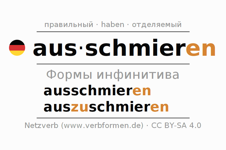 Этот глагол ausschmieren полностью спрягается во всех лицах и числах Инфинитив Презенс Перфект.