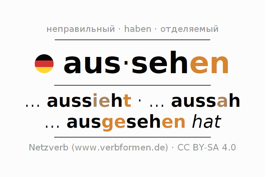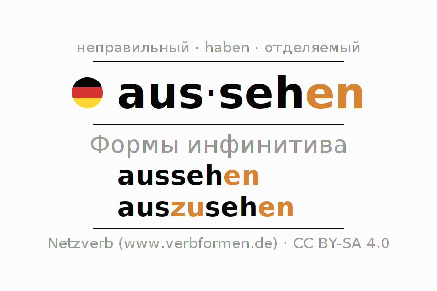 Спряжение aussehen в Инфинитив Презенс Перфект основная форма Действительный залог (актив): ausseh(e)n, auszuseh(e)n.Образование этих форм происходит по определённым грамматическим правилам. Так же спрягаются простые глагольные формы aussehen в Инфинитив. Kомментарии ☆