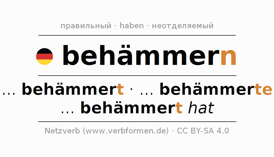 Этот глагол behämmern полностью спрягается во всех лицах и числах Инфинитив Презенс Перфект.