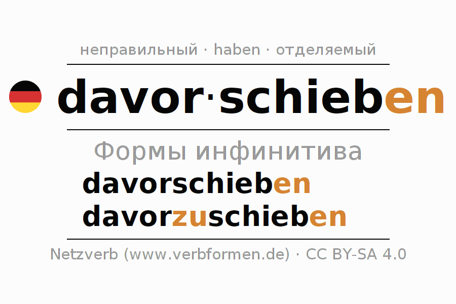 Этот глагол davorschieben полностью спрягается во всех лицах и числах Инфинитив Презенс Перфект.