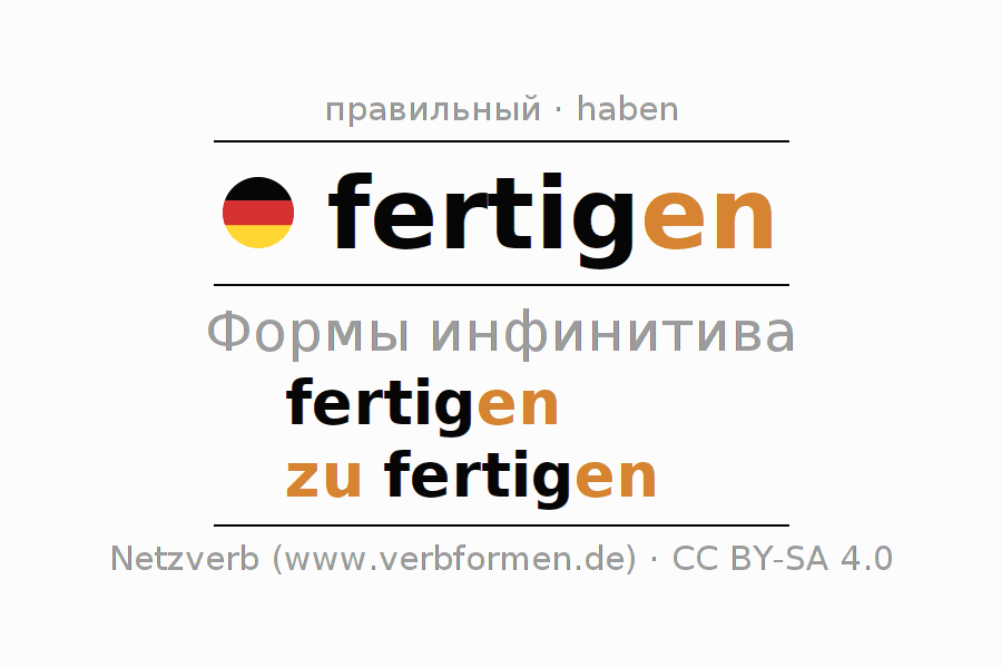 Этот глагол fertigen полностью спрягается во всех лицах и числах Инфинитив Презенс Перфект.