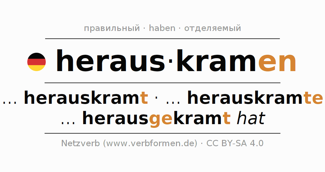 Этот глагол herauskramen полностью спрягается во всех лицах и числах Инфинитив Презенс Перфект.
