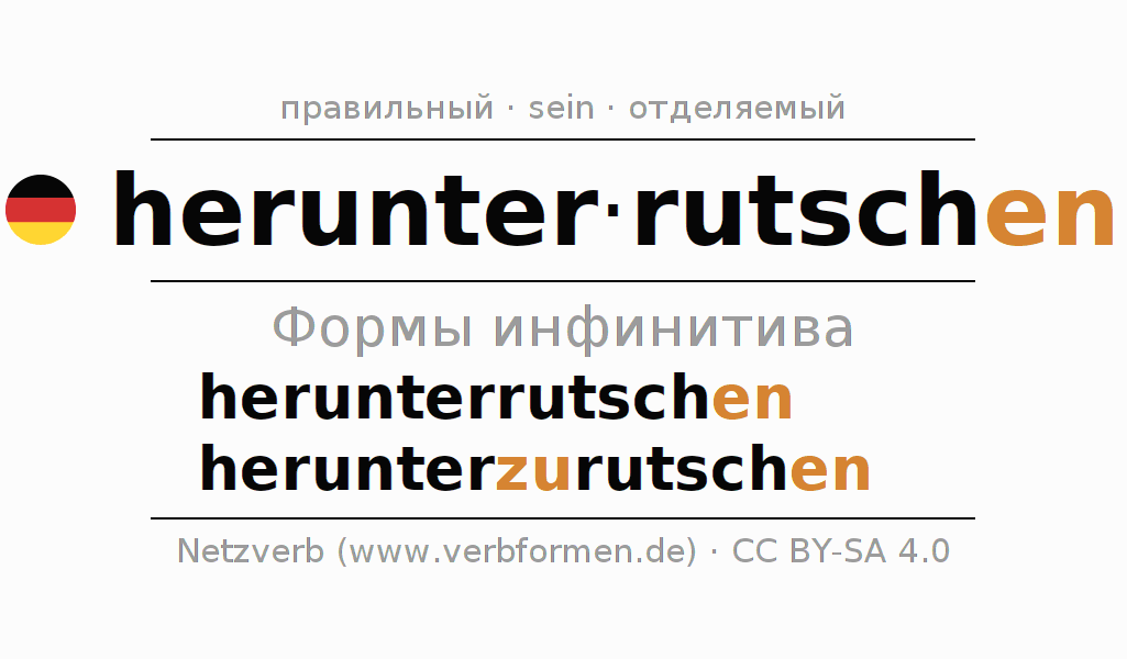 Этот глагол herunterrutschen полностью спрягается во всех лицах и числах Инфинитив Презенс Перфект.