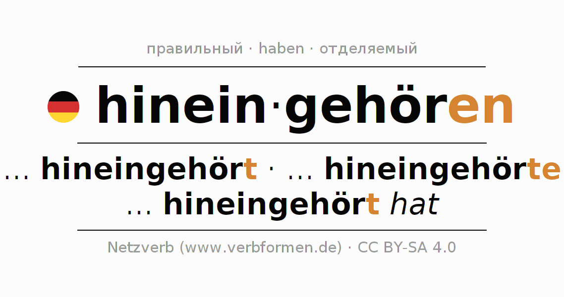 Этот глагол hineingehören полностью спрягается во всех лицах и числах Инфинитив Презенс Перфект.
